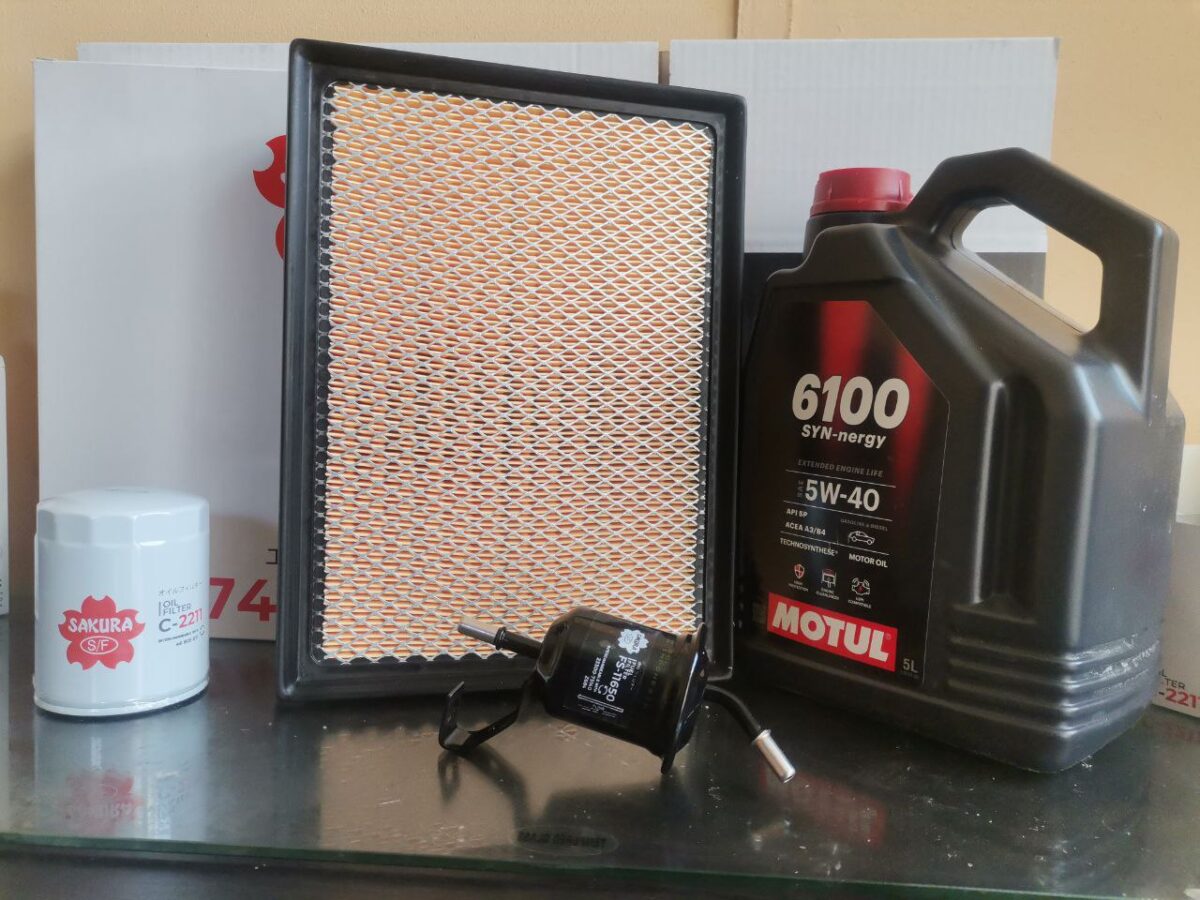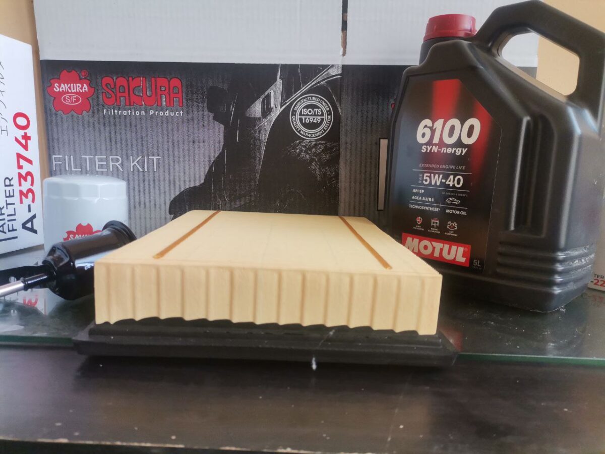 Complete service kit for Toyota Hilux & Fortuner 2.7 VVTi (2016-Up). Includes Sakura air, oil, and fuel filters plus Motul 6100 SYN-nergy 5W-40 engine oil – everything you need for a professional service.